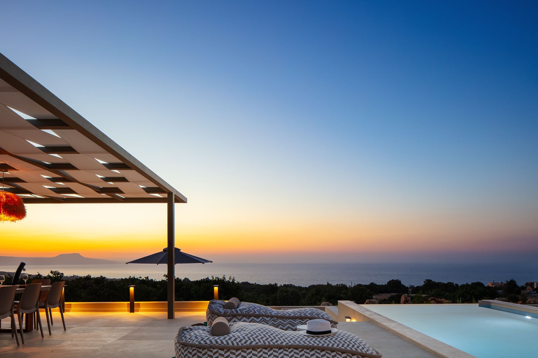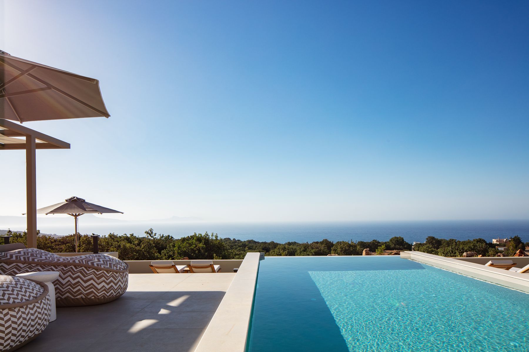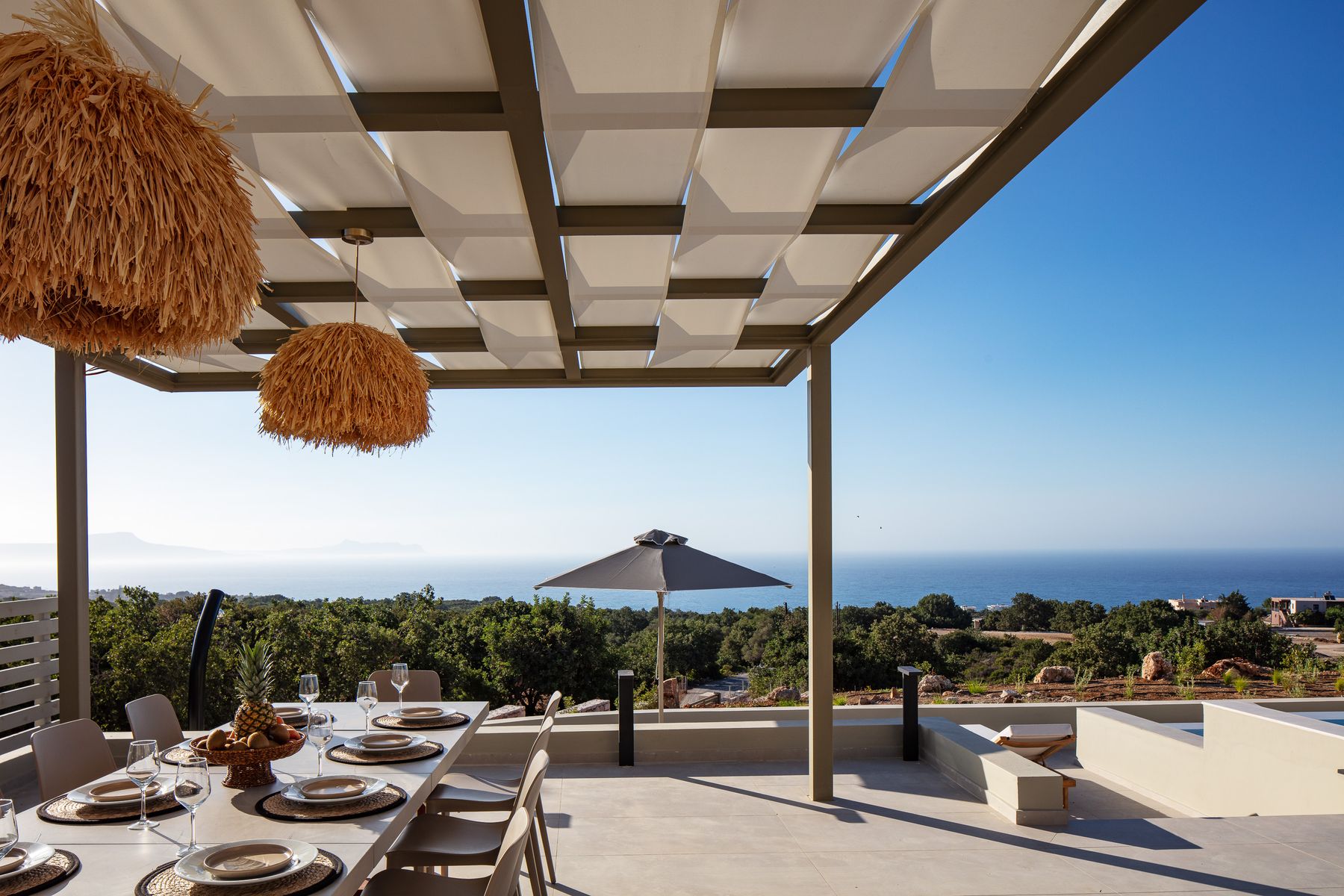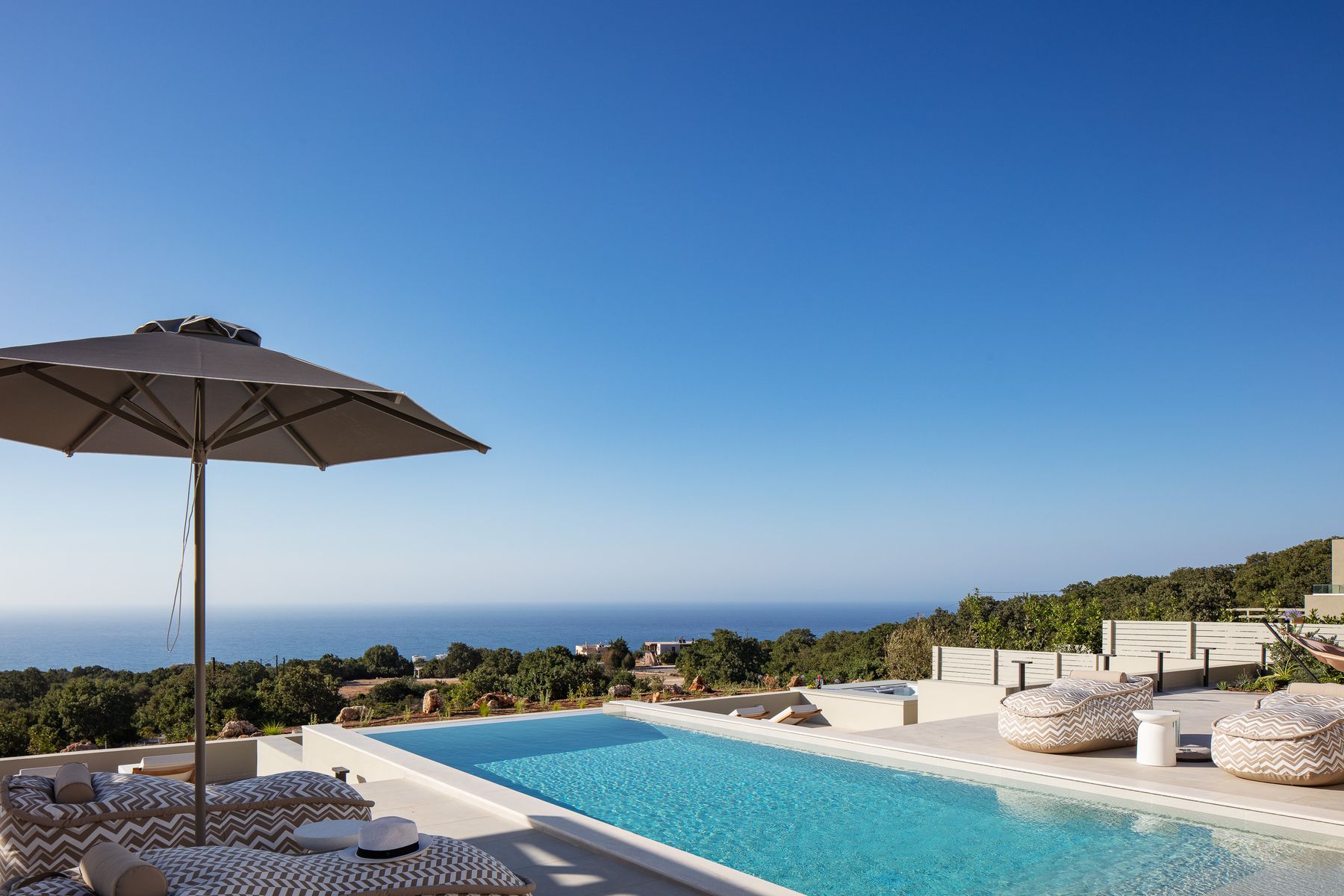 This residence lays in 500m2 outdoor area and is embellished with a 50m² private eco swimming pool (1,50 meters deep) featuring sea views, also boasting an outdoor spa whirlpool features (6 seater), a 5m2 children’s pool (0,20m2 depth), fire pit, premium sun-beds & umbrellas. Grown-ups can lounge to their premium sun loungers before idling back for al fresco dining under sunset skies, on the outdoor dining area featuring a BBQ (Gas). There is sufficient parking space for up to 2 cars outside of the residence premises. For our younger guests there are outdoor playground to enjoy & a ping pong table. Some portable fitness equipment is also available during your stay ( yoga mats, free weights & met ball). The infinity pool & outdoor area features impeccable sea views.