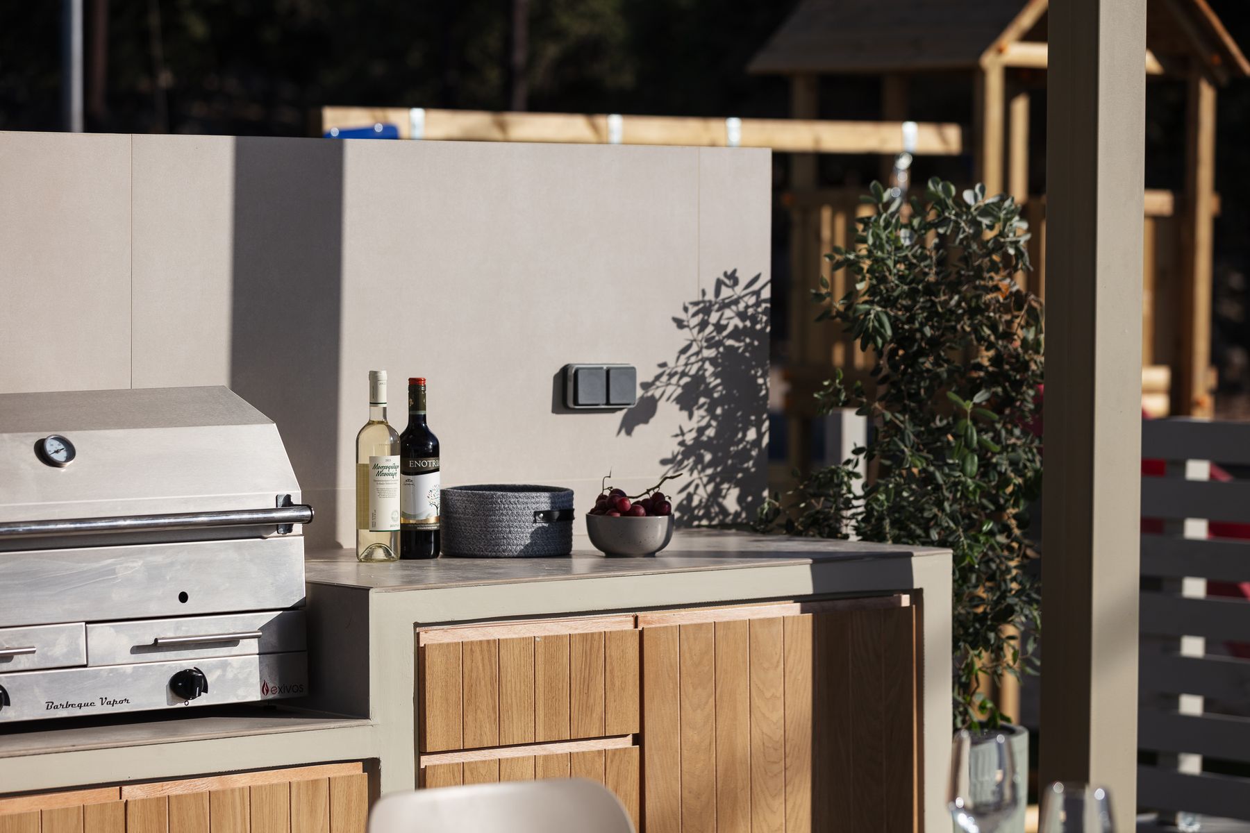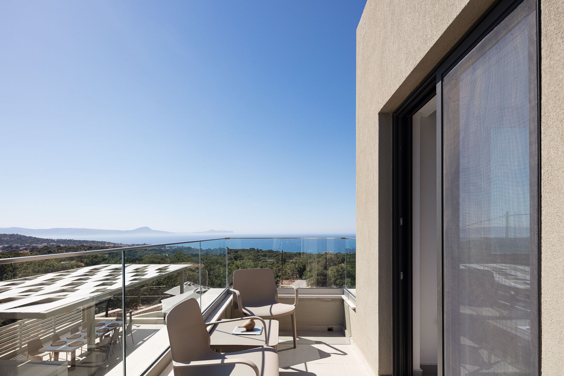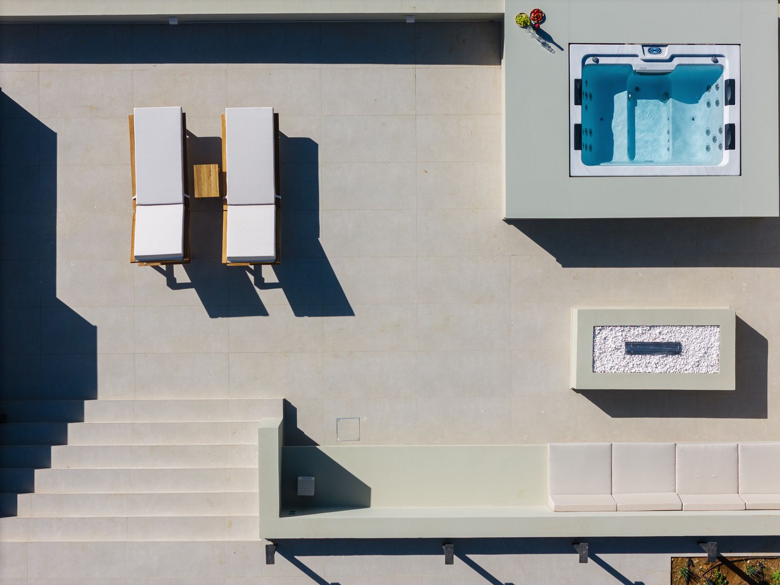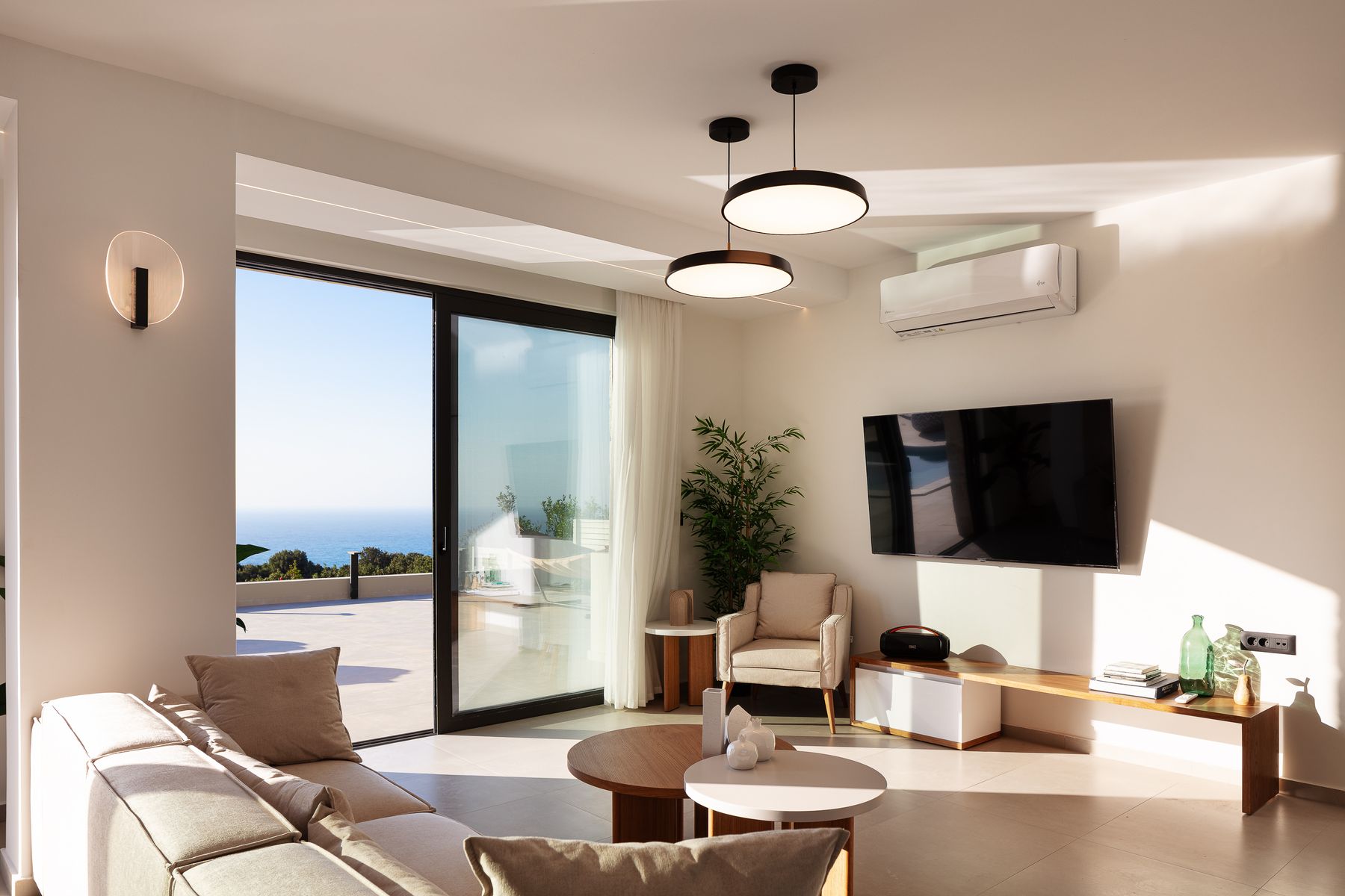 This residence lays in 500m2 outdoor area and is embellished with a 50m² private eco swimming pool (1,50 meters deep) featuring sea views, also boasting an outdoor spa whirlpool features (6 seater), a 5m2 children’s pool (0,20m2 depth), fire pit, premium sun-beds & umbrellas. Grown-ups can lounge to their premium sun loungers before idling back for al fresco dining under sunset skies, on the outdoor dining area featuring a BBQ (Gas). There is sufficient parking space for up to 2 cars outside of the residence premises. For our younger guests there are outdoor playground to enjoy & a ping pong table. Some portable fitness equipment is also available during your stay ( yoga mats, free weights & met ball). The infinity pool & outdoor area features impeccable sea views.