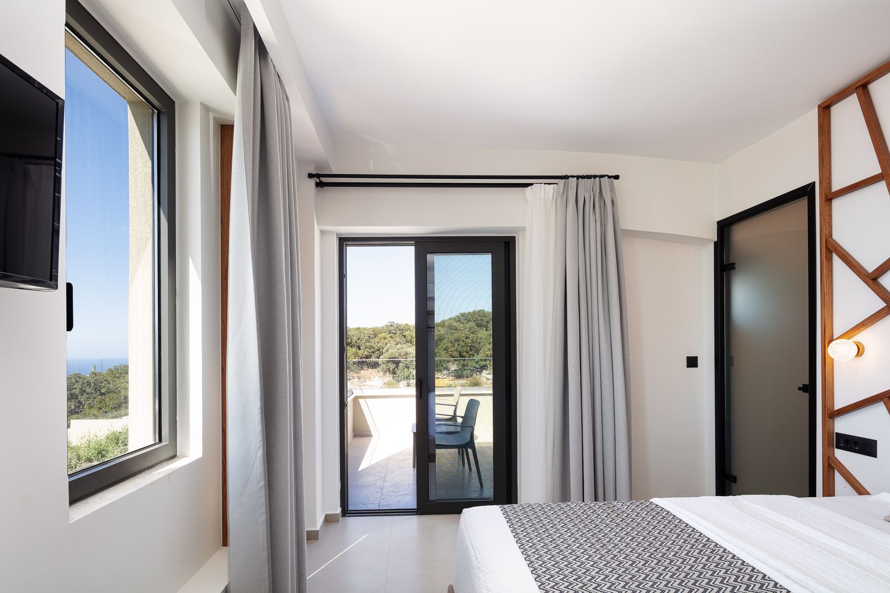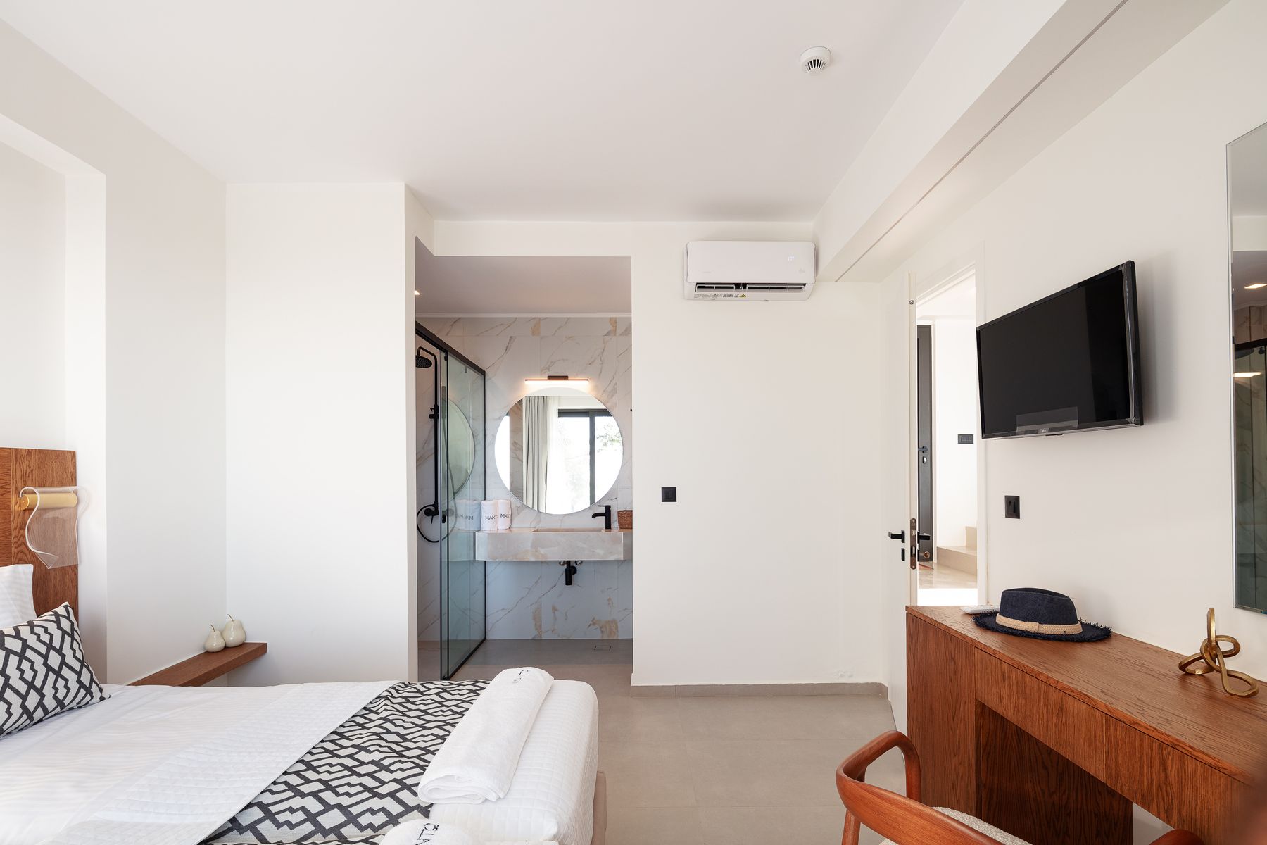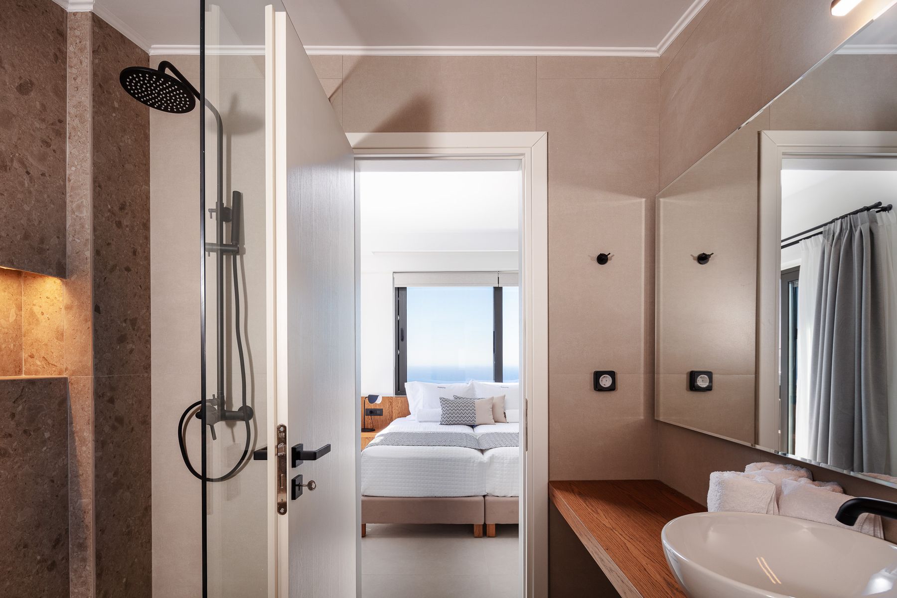 Master SeaView Double Bedroom featuring a Queen Size bed (1.60×2.00) with en-suite bathroom, walk in shower, 42’ smart TV & access to a balcony with Sea Views •Another Sea View Twin Bedroom featuring two single beds (0.90×2.00) with en-suite bathroom, walk in shower, smart TV & access to a sea view balcony.