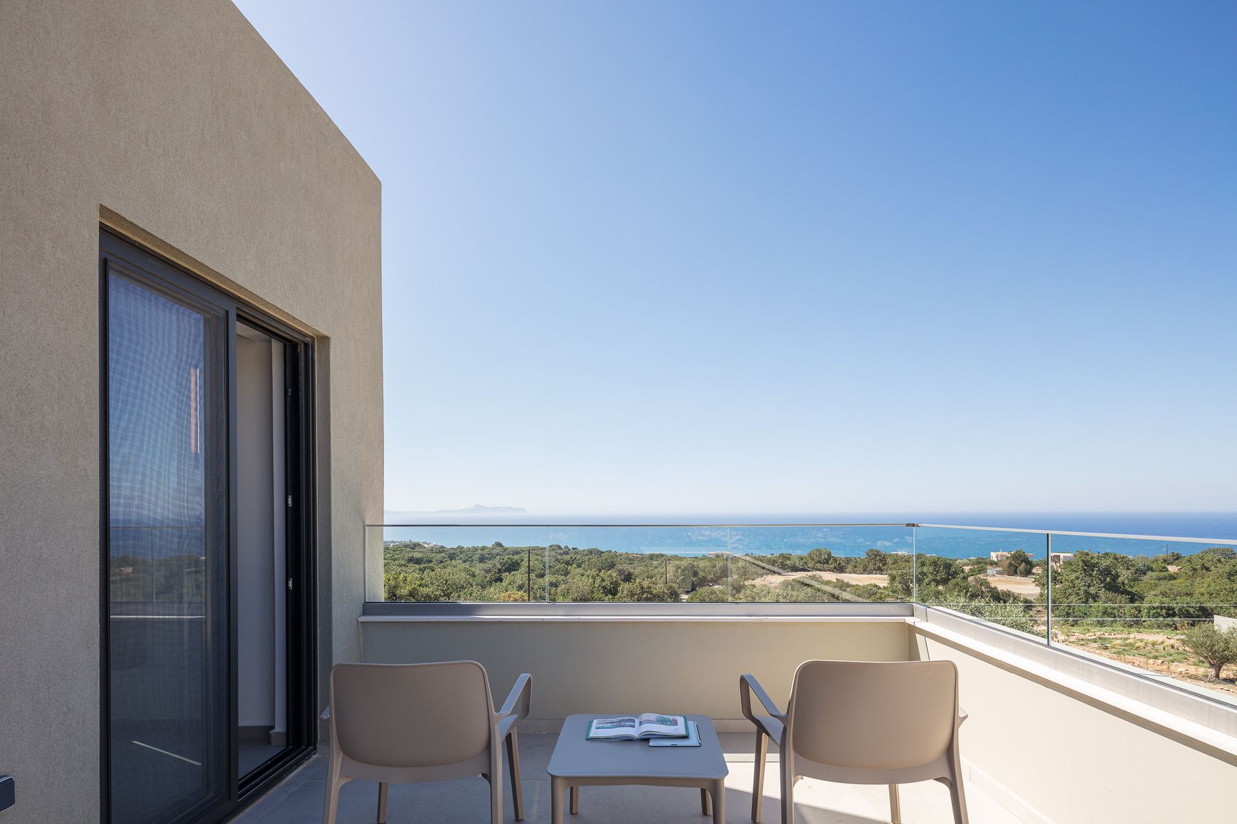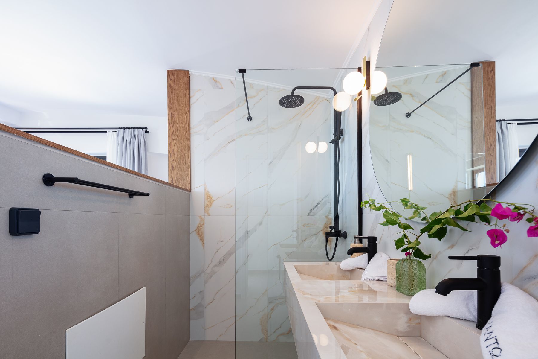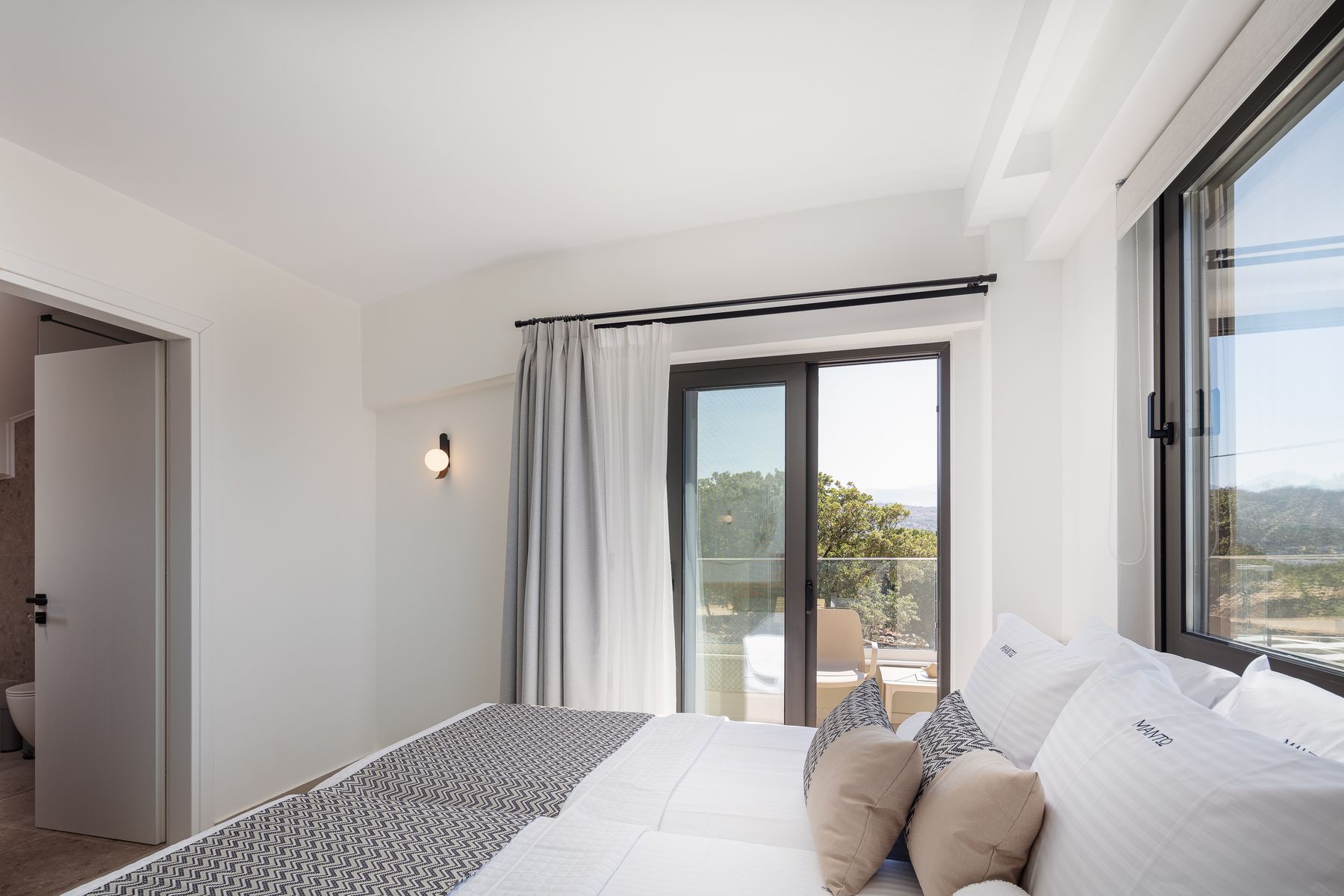 Master SeaView Double Bedroom featuring a Queen Size bed (1.60×2.00) with en-suite bathroom, walk in shower, 42’ smart TV & access to a balcony with Sea Views •Another Sea View Twin Bedroom featuring two single beds (0.90×2.00) with en-suite bathroom, walk in shower, smart TV & access to a sea view balcony.