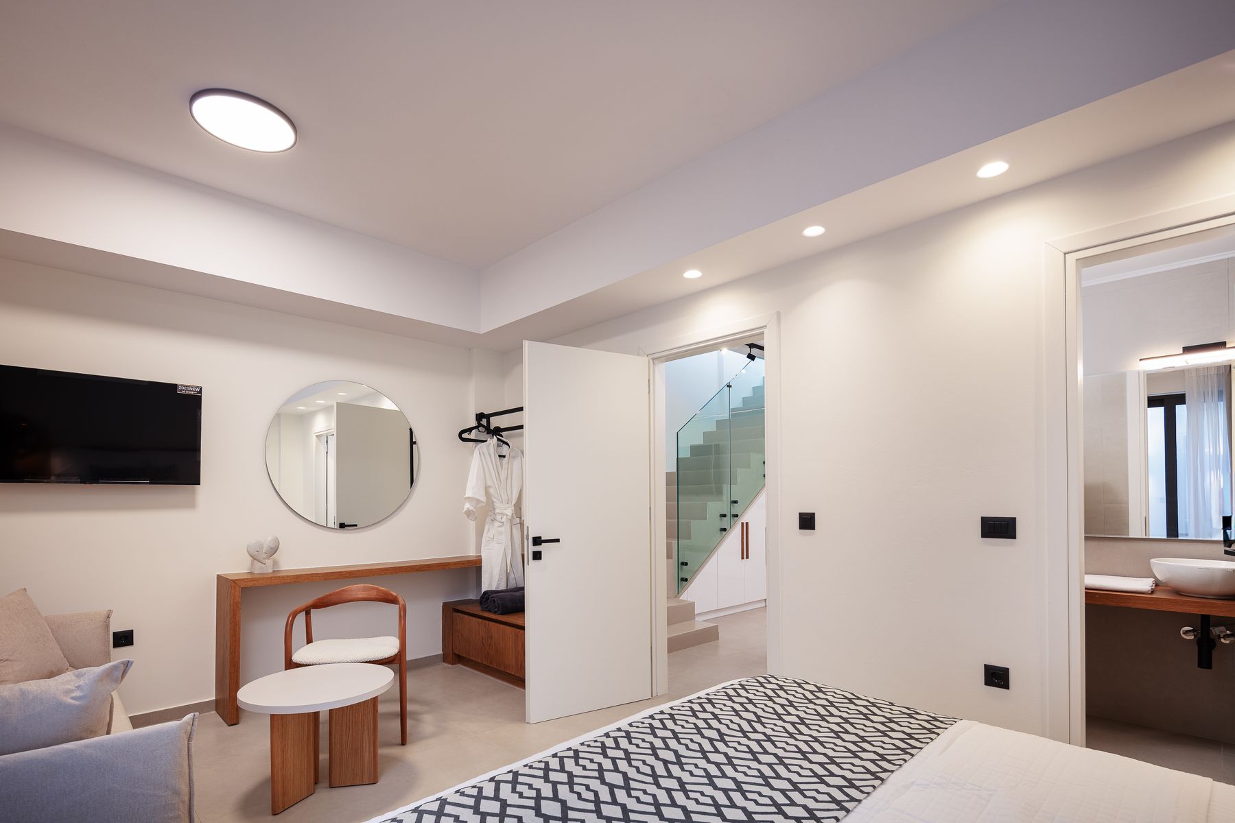 Living Room with a 65’ Smart TV, Fully Equipped Kitchen with window ( no views). A PS5 is also available for some game time • Two Premium Double Bedrooms are located in this floor each featuring Queen Size Bed (1.60×2.00), a 32’ Smart TV & an en-suite bathroom with walk in shower and access to a small veranda (no views), – two more guests can sleep at the double sofa bed located in the room • Stairs leading to the Ground Floor & 1st Floor Bedrooms.